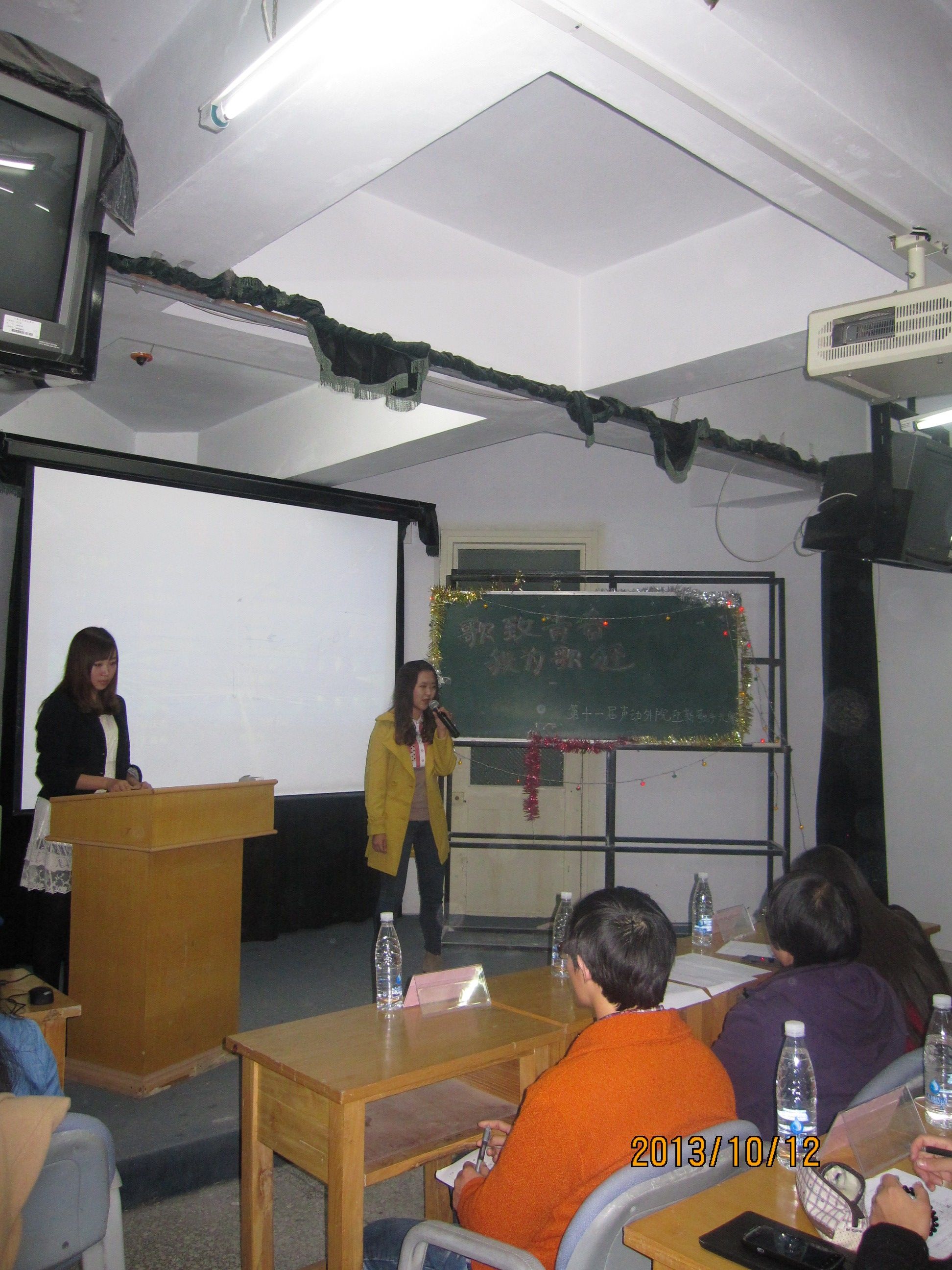比赛现场,508教室人潮涌动,参赛者们齐聚一堂。大赛设定以每位选手自选曲目清唱一分钟为表演内容,各评委现场打分、报分。选手们在舞台上施展着自己的才华,清唱丝毫阻挡不了同学们的演唱热情。从流行金曲到悠扬民歌,同学们用自己独特的方式演绎了一曲曲动人的旋律。他们对音乐的热爱与感悟有如《让爱领舞》般动感十足,如《后来》般意蕴悠长,如《梅花三弄》般充满民族气息……最后,来自2010级朝语系的左凯辉师哥为同学们带来自己的原创歌曲《青春之歌》和《糖果》,让同学们感受到音乐给予人的感动和力量。整场比赛为观众带来了一场听觉上的饕餮盛宴,现场不时爆发出阵阵掌声。最终,本次比赛共有十六位同学成功晋级决赛。