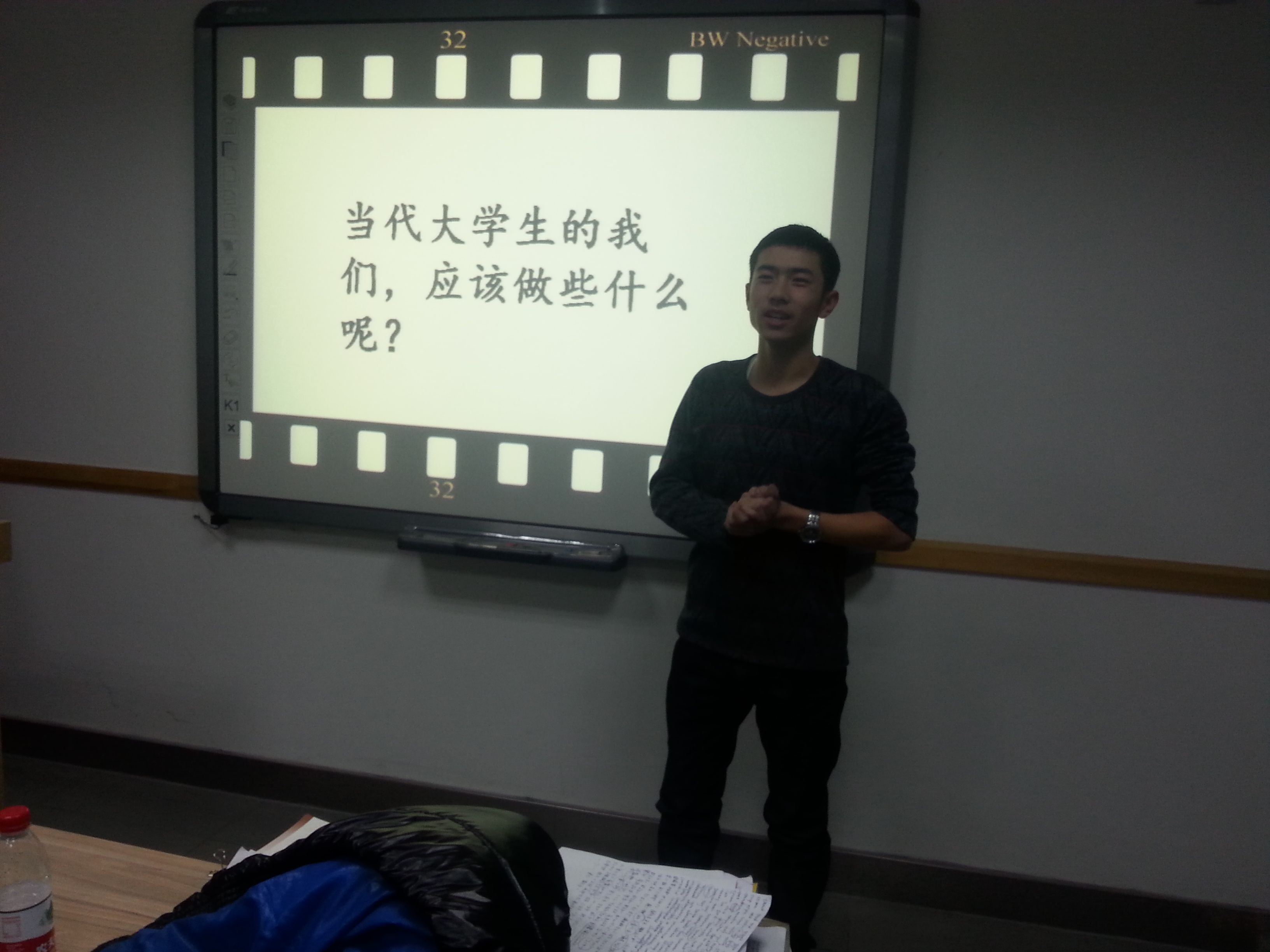 12月3日晚,在外语楼221教室,12级英语2班热烈开展一二•九班会活动。首先,大家观看一二•九记录视频,更直观的感受当时的革命斗争氛围。其次,播放有关“一二•九”运动的相关PPT,更详细系统的了解那段历史,包括运动的背景、过程、口号、意义等,让同学们充分理解当时为什么“华北之大,已经安放不下一张平静的书桌了”。最后,在团支书的带领下,全体成员起立宣誓,并深入思考,作为当代大学生,我们应该怎样将这一精神发扬光大。同学们各抒己见,畅所欲言。