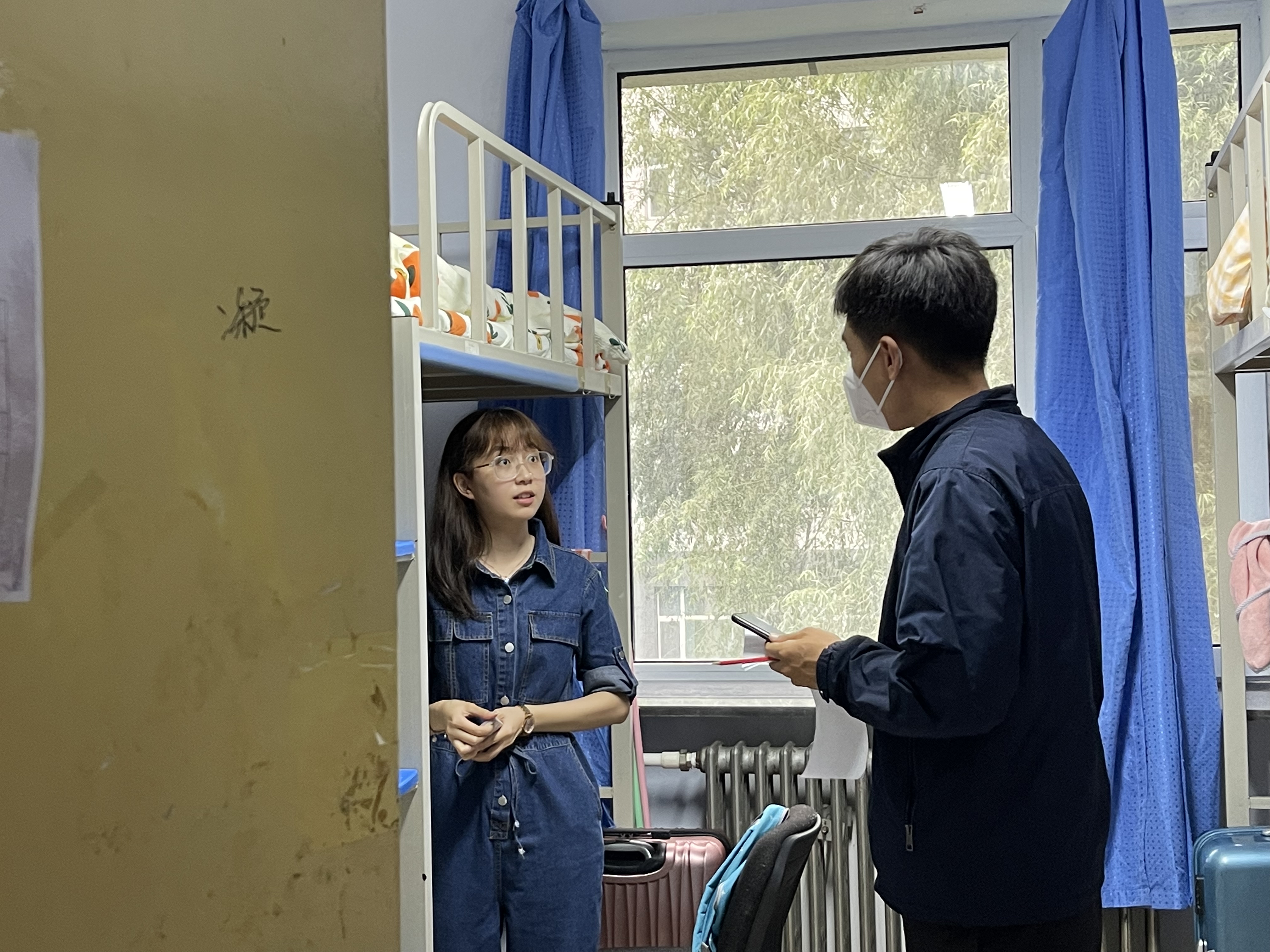 新生基本情况,学院学生工作办公室主任王一涵和年级辅导员楚恒叶、刘宇走访了南三、北二两栋新生学生寝室。