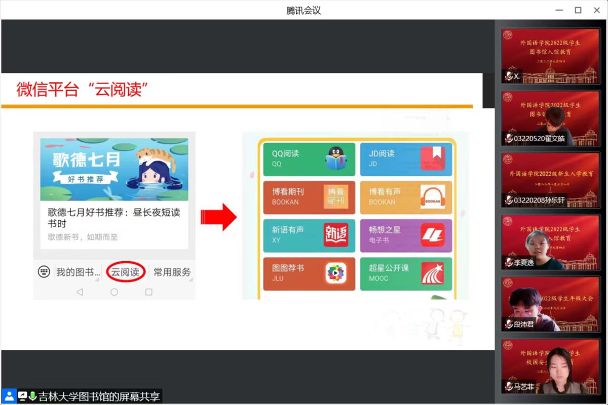 王老师主要从馆藏布局、服务项目与服务功能、开馆时间与入馆须知、借还流程与借阅规定、阅读引导及丰富的阅读推广活动等方面进行讲解。