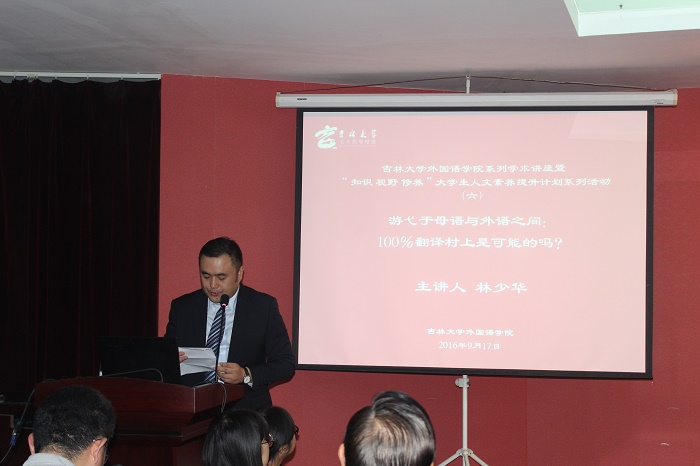 的感激。讲到自己的译作时,林少华坦言他的翻译应当是独树一帜的,“即便是错,也错的别具一格”;林少华教授从母语、外语和文体三个方面展开了对翻译的讲述。