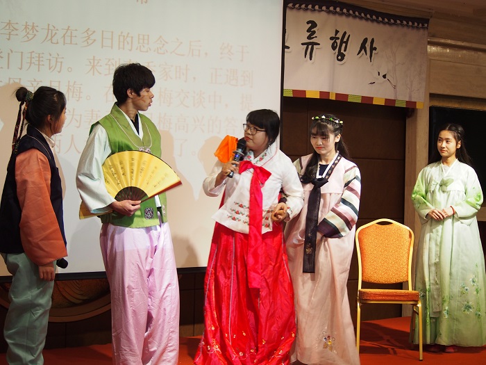 朝语系师生20余人前往新民宾馆与长春各高校朝鲜语系师生代表,驻长韩国留学生代表一同参加2015年“长春韩国周”活动开幕式暨长春中韩文化交流大会。韩国驻沈阳领事馆申凤燮总领事、东北三省韩国人联合会许景茂会长、锦湖轮胎长春工厂总经理,以及吉林省和长春市外事部门等相关领导一同出席。