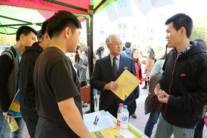 在学院外语文化节上与同学交流