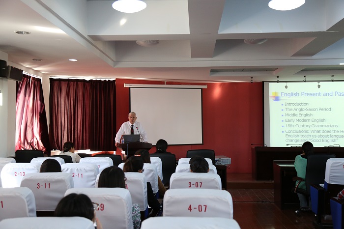 同一天,萨克雷教授为我校师生做了题为“English: Present and Past, What is Good English?”的学术讲座。在讲座中,萨克雷教授阐释了英语在漫长的历史更迭中在发音、词汇、语法等方面发生的变化,论述了语言变化的必然性。他认为语言的变化没有好与坏的分别,也不能简单地定义为是堕落还是进化,恰当地使用语言才是人文学科学生的重要功课。萨克雷教授学养深厚,在讲座中旁征博引,其风趣幽默的演讲风格引得师生阵阵掌声。此次学术讲座对我校广大师生提升人文素养、开拓学术视野、提高科研水平具有重要意义。