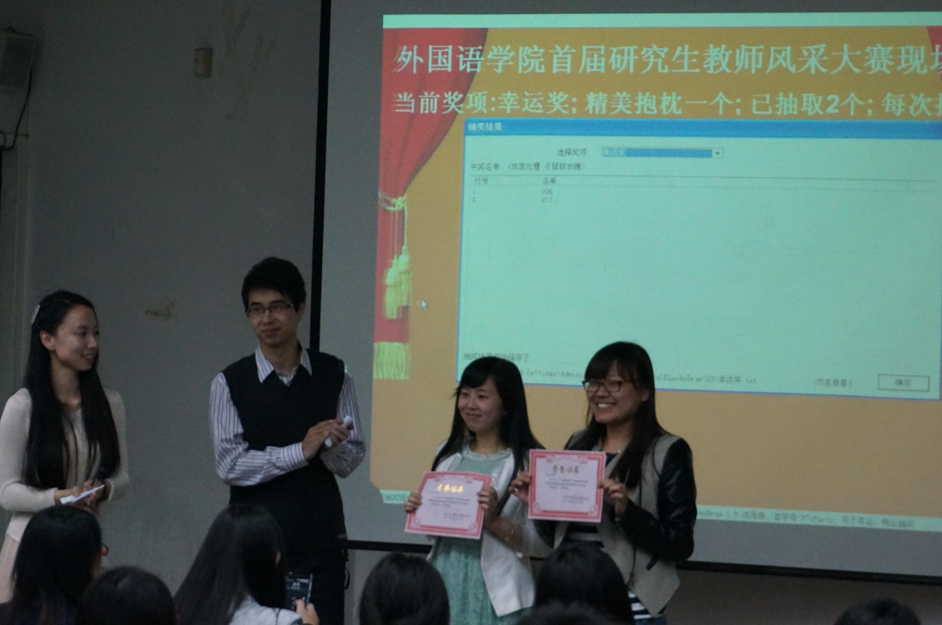 为了增强研究生的综合素质,提高研究生的实践能力,中文a片 于5月15日18:00在逸夫教学楼第六阶梯教室举办了“慎思笃行”中文a片 首届研究生教师风采大赛。学院2013级研究生与本科生代表参加了比赛。 本次大赛分为初赛和决赛两个环节。经过初赛的选拔,八名同学进入到决赛现场。本次决赛中,每名选手有十分钟的现场授课时间,最后由评委根据每名选手的现场表现进行评分和点评, 并且由20名本科学生选出最受学生欢迎的两名教师。决赛中选手们精彩而睿智的现场表现获得了评委老师和现场观众的一致好评。最终,经过评委打分和学生现场投票,2013级西班牙语语言文学专业苑雨舒获得一等奖,2013级英语语言文学专业徐杨、亚非语言文学专业范慧杰获得二等奖,英语语言文学专业李英菀、日语语言文学专业唐家林、俄语语言文学周磊获得三等奖。 外语专业研究生很大部分有未来从事教师行业的意愿,本次活动为学生提供了一个展示自我风采的平台,提升了学生综合素质和实践能力。同时,通过评委们的点评指导和现场观众的意见反馈,同学们了解了自己的实力和弱点,为下一阶段的学习提供了方向。