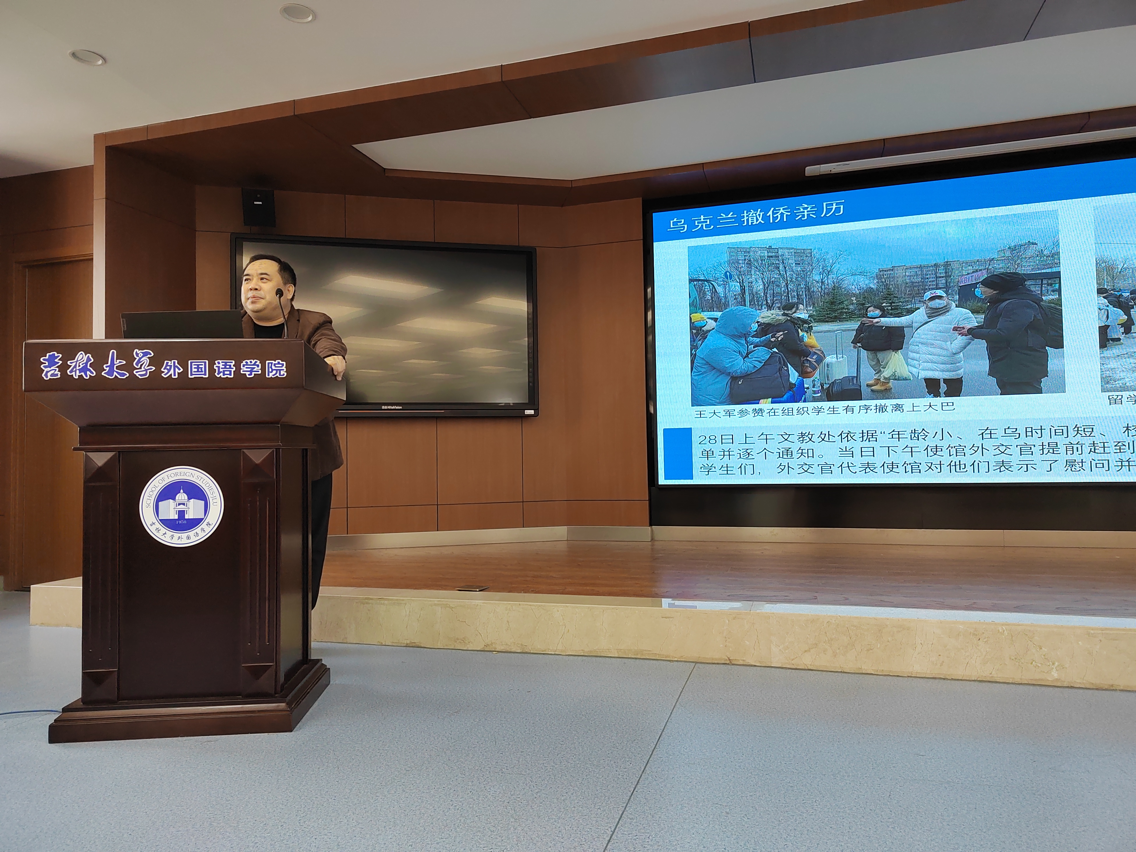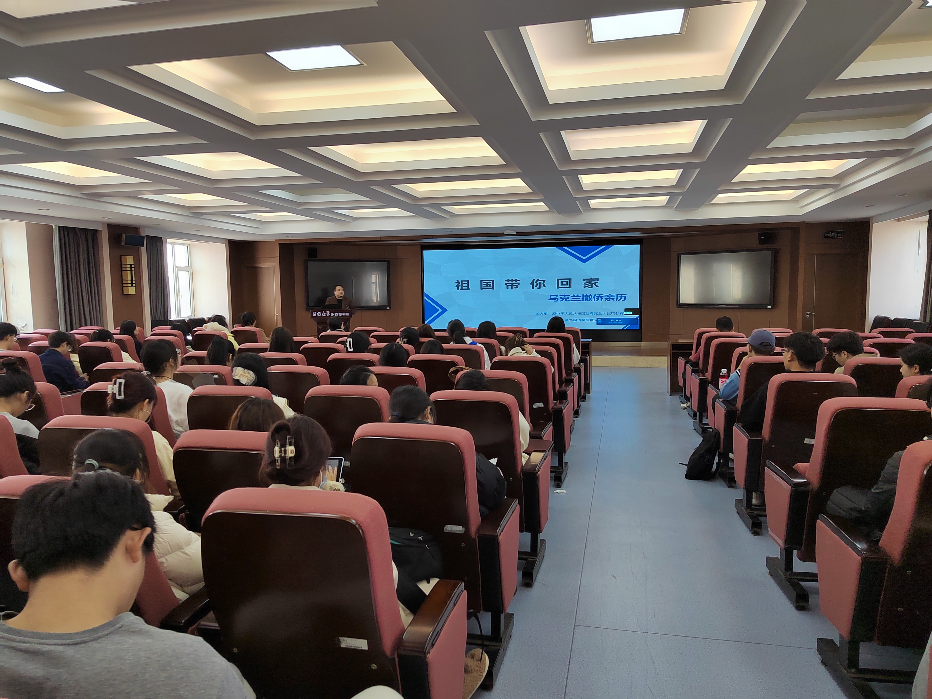 王大军参赞在本次讲座中以自2022年2月24日起发生的俄乌冲突的经过为线索,讲述了中国驻乌克兰大使馆全体外交工作人员在冲突爆发后对在乌中国留学生、务工人员等同胞们实施的撤离工作全过程、中途遇到的各种困难和温暖瞬间。俄乌冲突发生后,中国驻乌克兰大使馆立即开展紧急撤侨工作,组织在乌的中国公民通过第三国回到祖国。期间面对变幻莫测的局势、炮火的威胁,如何与每一位撤离人员取得联系并组织撤离路线、撤离车辆等都成为了使馆工作人员的难题。最终,在使馆全体工作人员的努力下,撤离工作有续完成。来自利沃夫音乐学院的学生还自发创作歌曲感谢使馆的付出,令人倍感温馨。