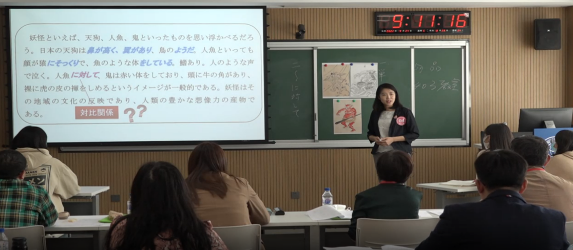 日文系潘宁老师以日本妖怪文化为切入点,通过“我来描述你来猜”等趣味互动活动调动学生积极性。通过日本妖怪对于中国神话借鉴的导入,培养学生对于本国文化的热爱,以及用外语讲好中国故事的能力,达到课程思政的目标。