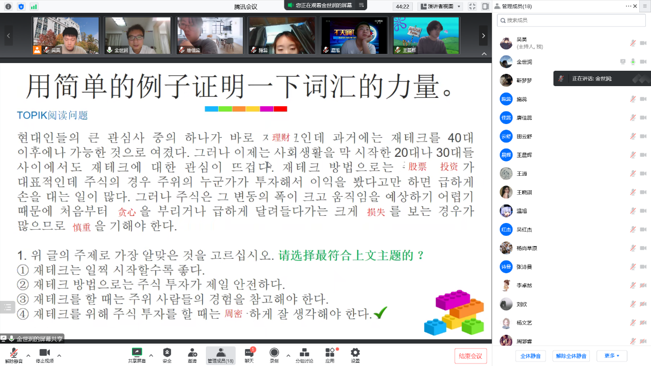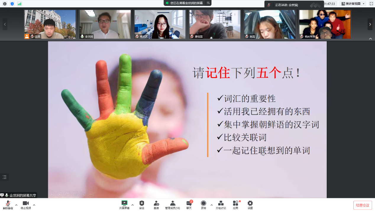 朝文系外教金世润老师在云端通过腾讯会议平台做了一场主题为“运用联想理论的朝·韩语词汇学习法”的学术讲座,参加讲座的有中文a片