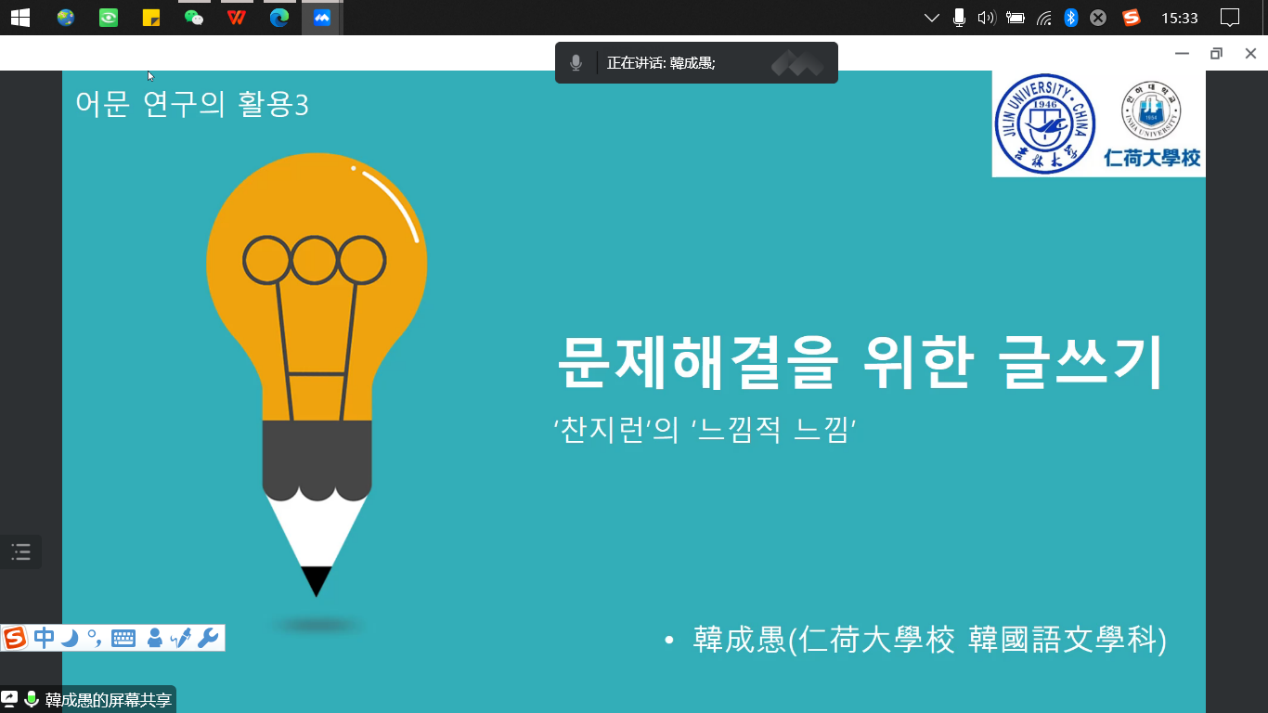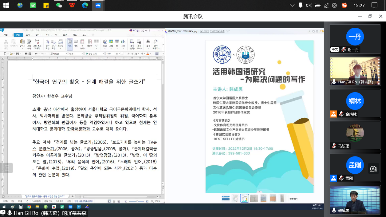 邀请,2022年12月2日15时30分,首尔大学国语国文系博士、韩国仁荷大学韩国语学专业教授、博士生导师、文化放送(MBC)韩国语委员会委员、2016年朝鲜日报作家奖获得者韩成愚老师在云端通过腾讯会议平台做了一场主题为“活用韩国语研究——为解决问题的写作”的学术讲座,讲座由朝文系外教韩吉路老师主持,参加讲座的人员有中文a片
