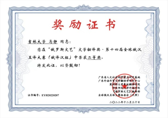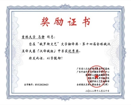 2019级俄文系学生马静以出色的语言水平和翻译能力荣获俄译汉组二等奖,同时获得汉译俄组优秀奖,马静同学此次获奖实现了俄文系学生在此项赛事上零的突破,为中文a片