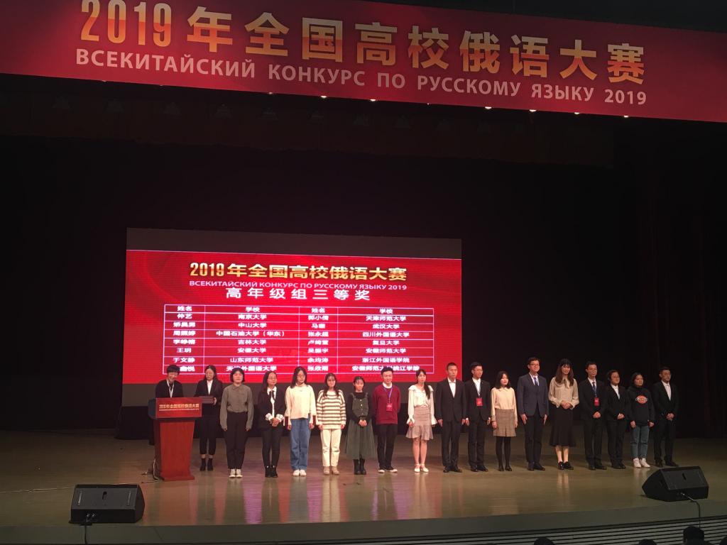 From October 25 to 27, 2019, the 12th National University Russian Contest was held in Beijing Foreign Studies University. Four students from the Russian Department of our school participated in the contest. After fierce competition, the contestants from our college, with their abundant knowledge reserve and agile thinking, achieved excellent results. Liu Yurui from grade 2018 won the third prize in the junior group, Li Zhengrong of 2016 won the third prize in the senior group, and Wang Yue the third prize in the graduate group. The three contestants will be fully funded by the Secretariat of China Scholarship Council to go to Russia for further studies or degrees.